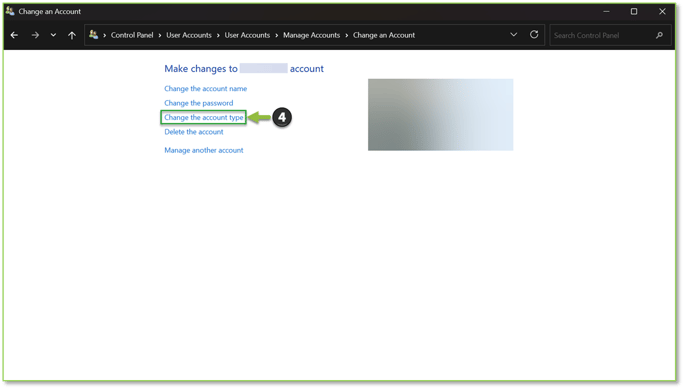 - After the User Accounts section opens, we will want to choose the Change account type action under the User Accounts header.