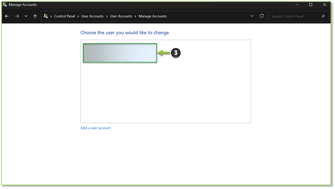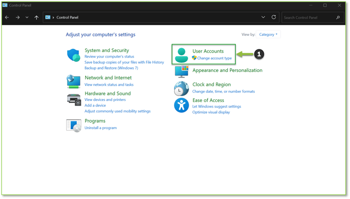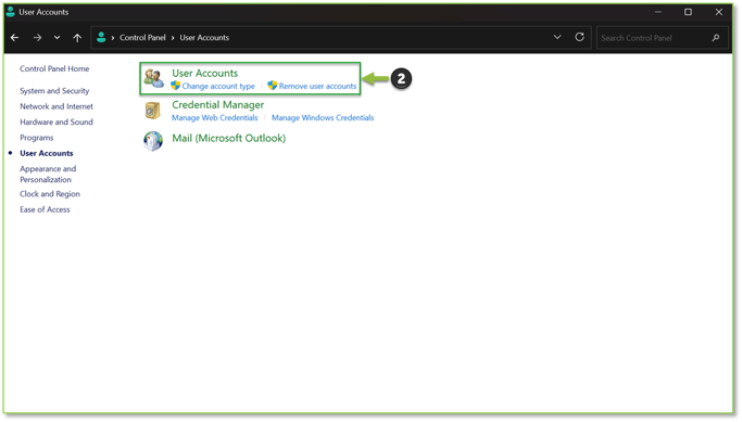 - For devices confirmed as Entra ID–joined and not MDM (Intune)-enrolled, we will want to open the Control Panel utility and choose the User Accounts header.
