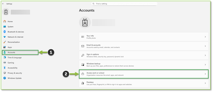 - Once you’ve granted temporary admin rights and restarted/signed back in, open the Settings utility. Go to the Accounts tab and select the Access work or school setting.