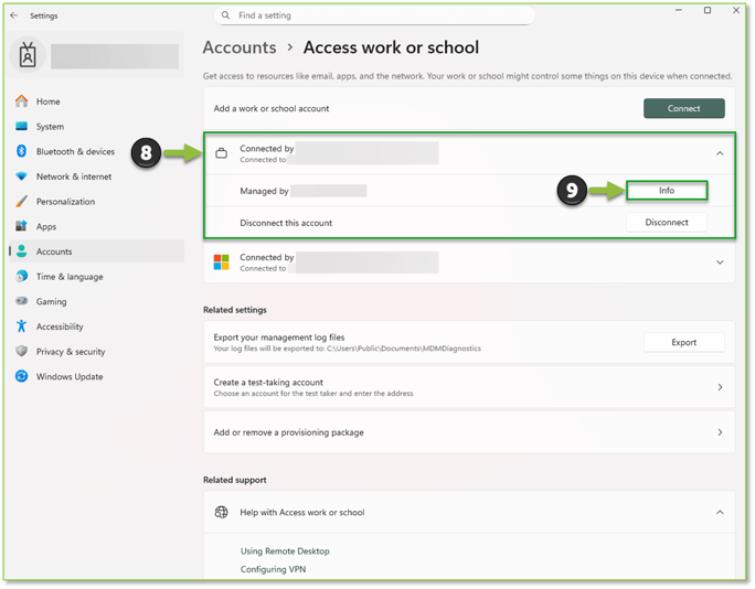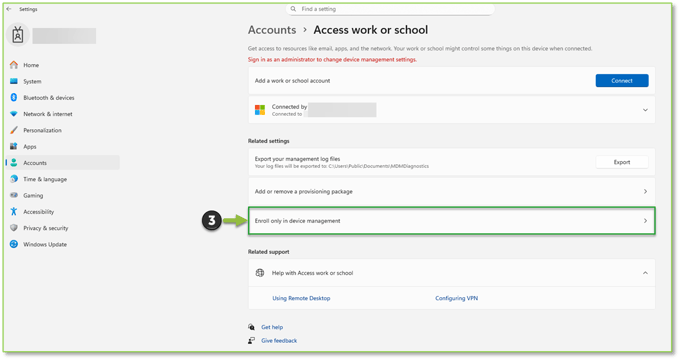 Note: This verification can be observed in Settings > Accounts > Access work or school, a device meets the criteria if you see a Connected by XXX entry that, when expanded, shows only a Disconnect this account setting with a Disconnect action (no Managed by XXX setting and no Info action). Seeing Enroll only in device management under Related settings—even with a Connected by XXX entry—also indicates it’s not MDM-enrolled.