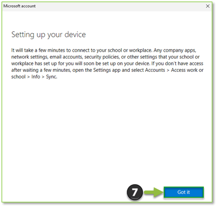 - After successful authentication, you’ll see the device setting up to connect to your workplace—this confirms the action has succeeded; select Got it to continue verifying the local-to-cloud connection.
