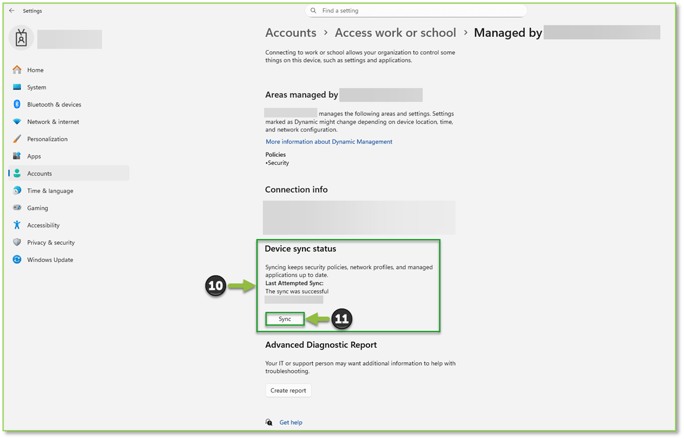 - Return to Settings > Accounts > Access work or school and look for the briefcase-icon Connected by XXX entry. Expand it, then choose the Info action next to the Managed by XXX setting to start a local sync with Intune.