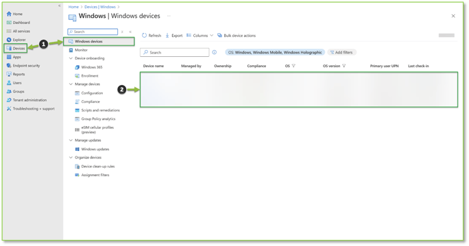 - Open the following Intune Devices link and confirm the machine now appears. From the list, select the device that just completed MDM enrollment.