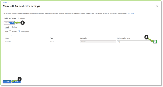 - Once inside of the desired Authentication Method, you can either deselect the Enable switch to revoke the ability users to register this method or select the X next to the desired Group(s) to revoke members of that group from registering this method. Once the proper adjustments have been made, select Save to finalize the Authentication Methods user removal process.