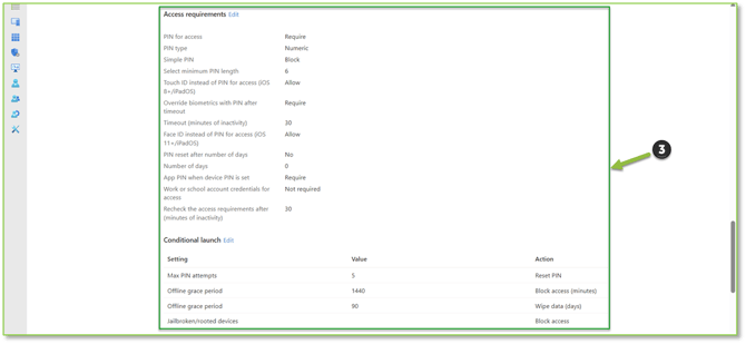 - Access Requirements: Specifies authentication requirements that must be met when accessing an application if users are required to enter a pin before accessing the app or setting a session timeout for inactivity.