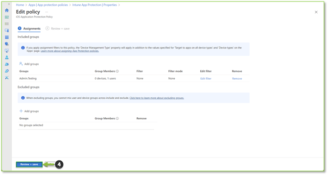 - Assignments: Specifies which Groups will be included or excluded from rule enforcement.
