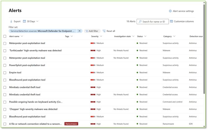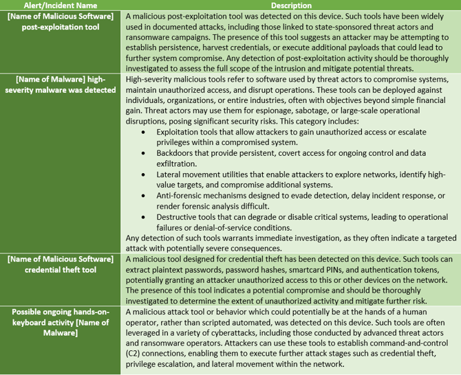 - Alert Name: The title of the alert that summarizes the nature of the security event, such as "[Malware Name] heigh-severity malware was detected" or "[Name of software] post-exploitation tool." Provides a quick overview of the identified issue.