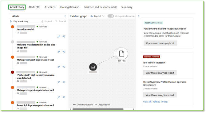 - Incident Graph: A visual representation of the relationships between entities involved in the incident, such as users, devices, files, and network connections. Displays the attack's progression and identifies patterns or correlations among different components.