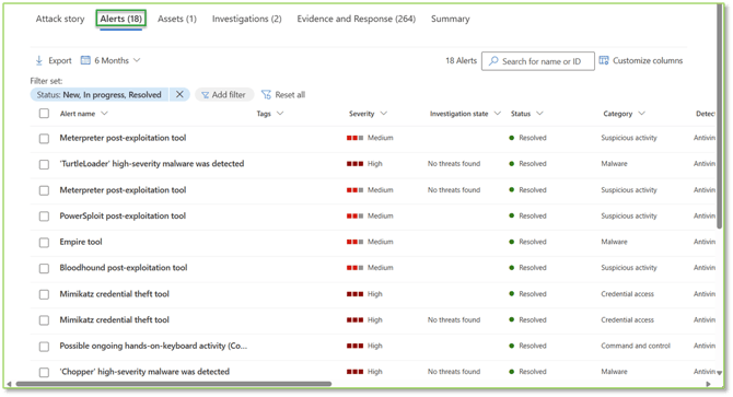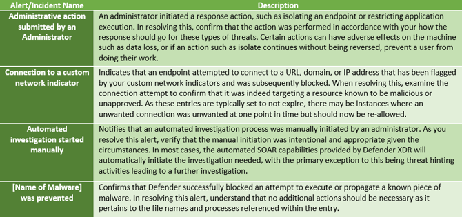 This fact is due to the nature of the Defender alert and incident management system, wherein, alerts are the drivers for incidents. An alert contains the specifics about a point in time threat or activity, and incidents are simply one or more alerts combined. This means a single alert has a high likelihood of generating an incident, and when an alert is remediated or resolved, the incident mirrors this status. The resulting workflow works best when working through alerts first, and then incidents, allowing the resolution of alerts to automatically solve incidents without further intervention in most cases.