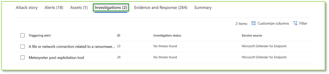 - Investigation Status: The current state of the automated investigation, such as "No Threats Found. Indicates progress and whether further manual intervention is required.