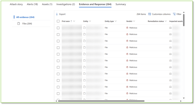 - Evidence Entries: Lists specific data points supporting the alert, such as devices, files, or applications. Serves as the basis for tracking affected types of entities and their status.