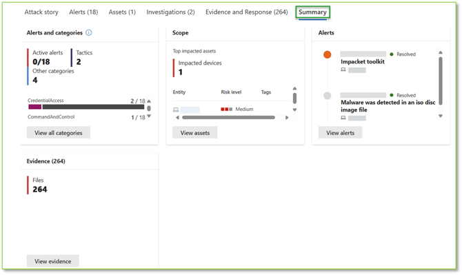 - Alerts and Categories: Provides information on the number of unresolved alerts tied to this incident, MITRE ATT&CK framework tactics identified in the alerts, and general classification tags associated with the alerts.