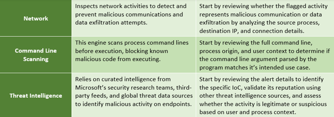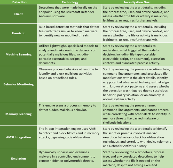 As it pertains to alerts and incidents for devices, the detection technologies are derived from Microsoft Defender Antivirus or Microsoft Defender Advanced Threat Protection.