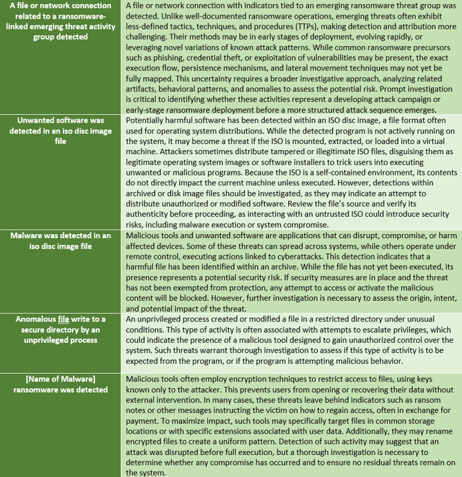 - Detection Status: Insight into how a threat was identified and handled, such as “Detected”, “Blocked”, or “Prevented”. These statuses help security teams understand the nature of threats and the effectiveness of their security measures, guiding appropriate responses to maintain organizational security.