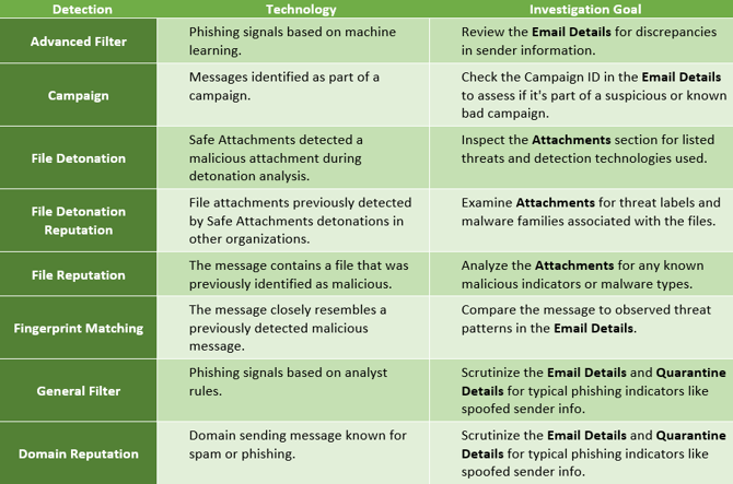 Understanding “Spam”, “Phish”, or “Malware” is only the general determination. The delivery details section specifies the status of the emails. Use this section to determine the how the determination has changed since being initially allowed and align the email security information and context activities to investigate this determination. For Microsoft’s verbatim definitions of these, view the knowledge article here.