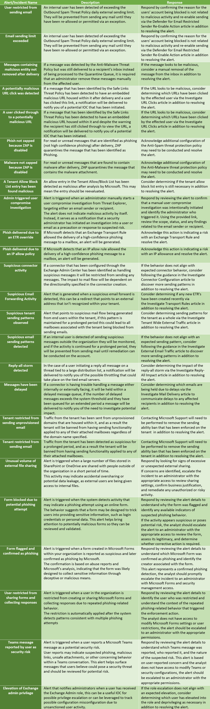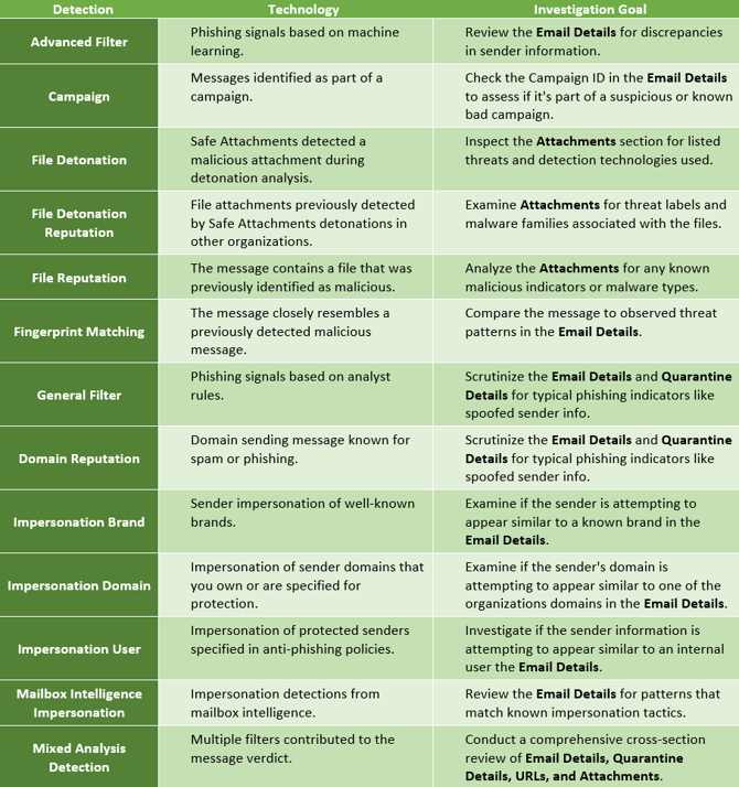 As it pertains to alerts and incidents for email, the detection technologies are mirrored in the same way as in the quarantine queue and reflect identically. For Microsoft’s verbatim definitions of these, view the knowledge article here.