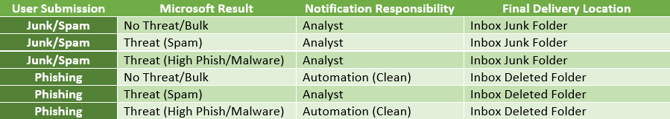 Once a user reports an email, Microsoft’s system automatically re-scans as if it was being delivered to the mailbox at the time of report, and categorizes it as one of these: