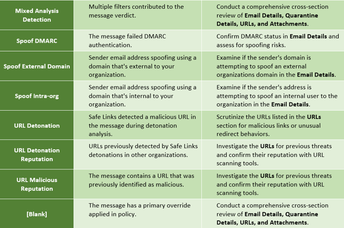 - Threats Found: Confirmed to have a threat such as spam, phishing, or malware. Probable cause for why this email was delivered to the inbox can be attributed to newer spam campaigns or a change in URL or file determinations post-delivery. It is typically a spam determination, as ZAP functionality can proactively remove a phishing or malware threat from user inbox via action center approval, however, edge cases where user submissions time beats the continuous rescanning this service employs can occur.