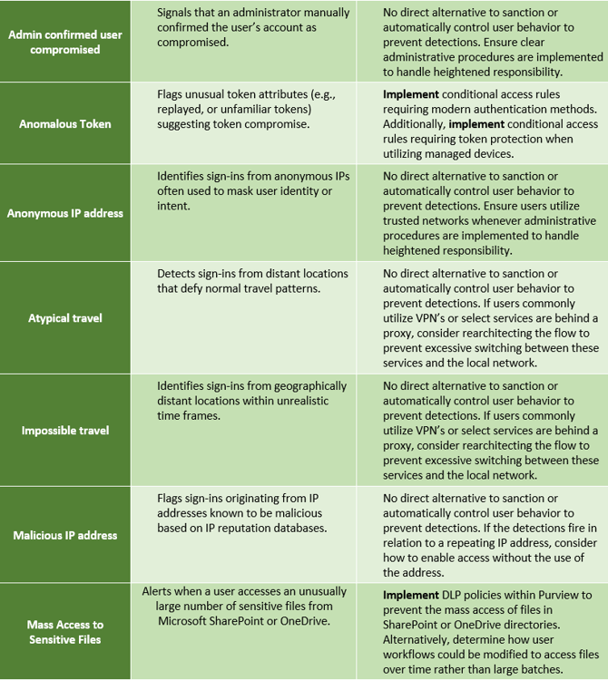 Some detection technologies can create large amounts of false positives, resulting in alert fatigue and unnecessary analyst workload. By refining what sanctioned behaviors look like—defining known-good patterns and trusted baselines—or employing compensating controls such as conditional access policies, organizations can reduce these non-actionable alerts. This allows analysts to focus their efforts where it truly improves the security posture.