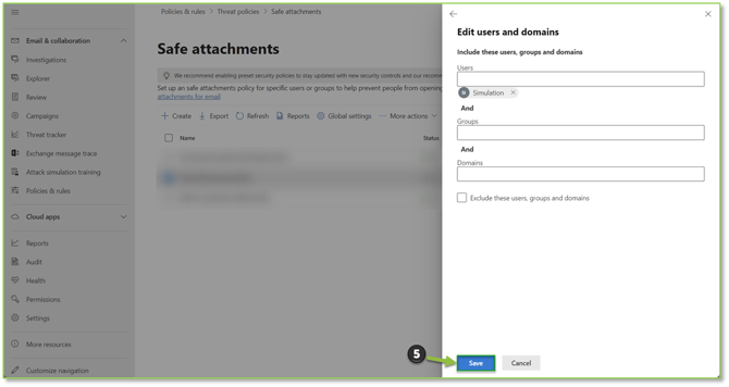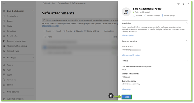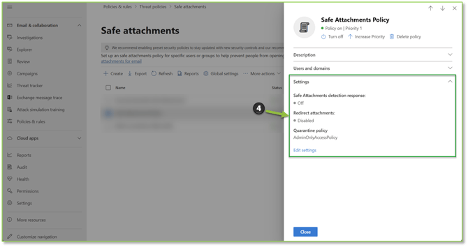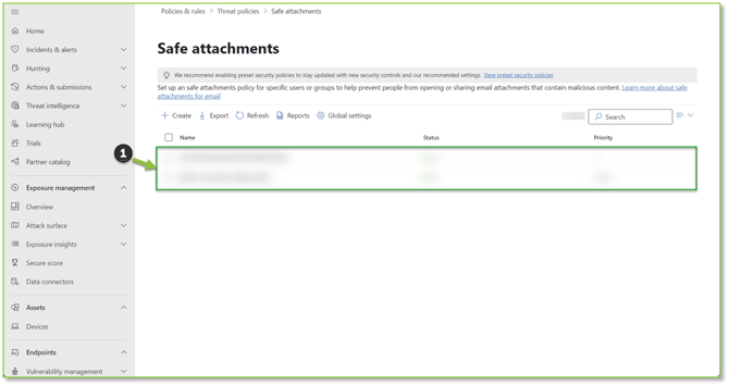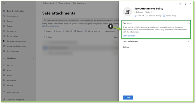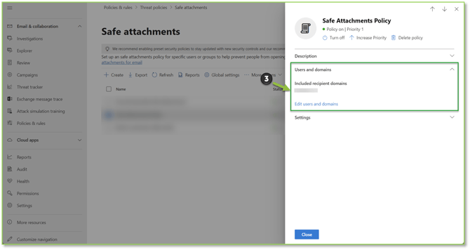 - Navigate to the Safe Attachments – Microsoft Defender portal, locate and select the policy you wish to alter.