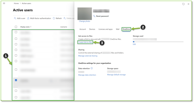 - Navigate to the Active Users – Microsoft Admin Center portal, locate and select the user you wish to generate the OneDrive external share report for. Once the desired user is selected, we will want to locate and select the OneDrive tab from the generated flyout. We will want to select the Create link to files action under the Get access to files section.