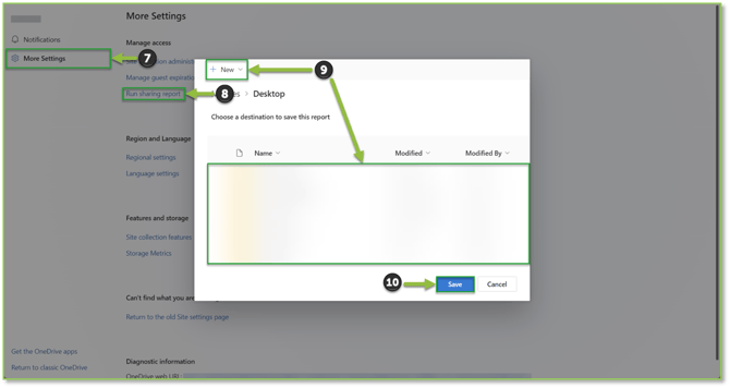 - From the Settings page, we will want to select the More Settings tab. Once there we will want to locate and select the Run sharing report action, a popup will be displayed where you will be able to designate a storage location for the report, this can either be an existing folder or select + New to create a new folder to store the report. Select Save once a desired report storage location has been specified.
