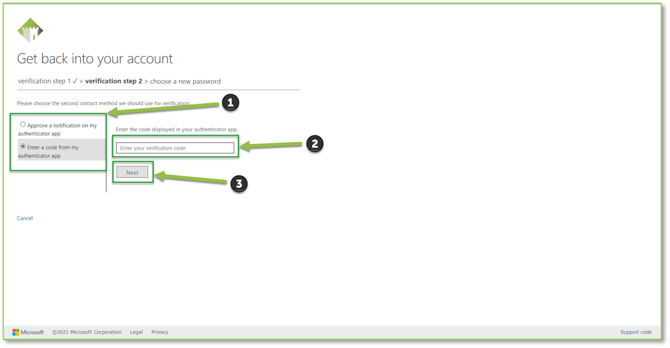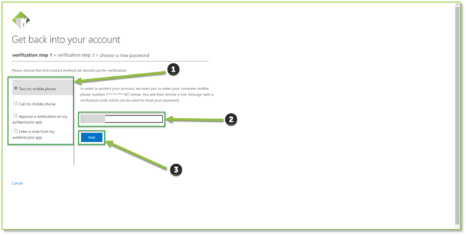 - Next, you'll need to receive a security code. Choose how you'd like to get it: text, call, or via the Microsoft Authenticator app. Punch in the code once you get it.