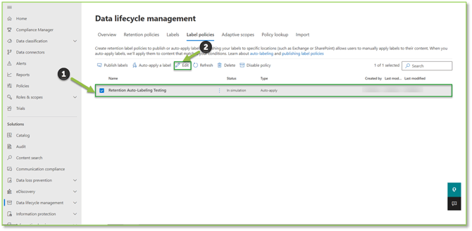 - Navigate to Retention Label Policies – Purview portal, locate the policy you wish to alter. Select Edit to begin the modification process.