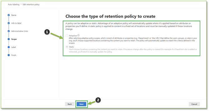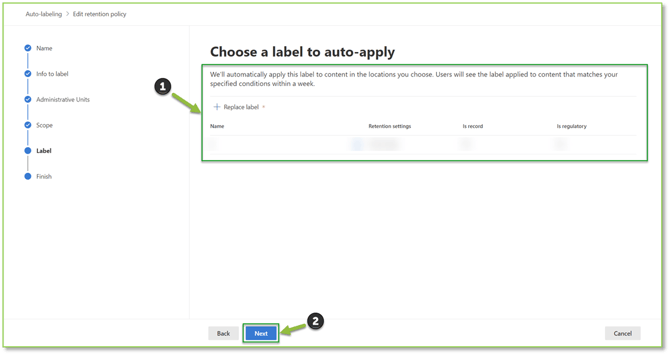 - Label: Specify the retention label that will be utilized by the auto-apply policy.
