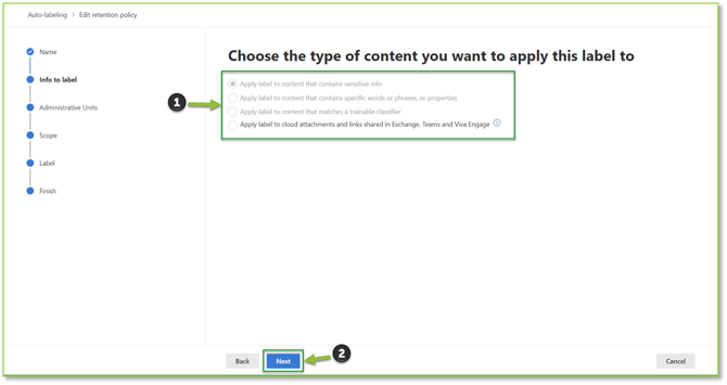- Info to Label: Specifies the type of content you want to auto-apply the label too the content can vary from sensitive info possession to known cloud attached items. This section cannot be modified after creation. Depending on the content type selected, you will be able to adjust the parameters for the conditions set on the following pages.