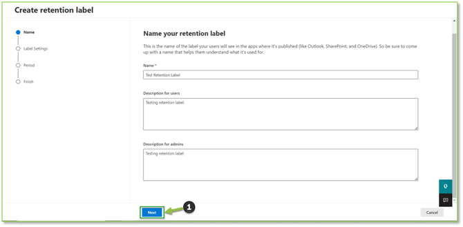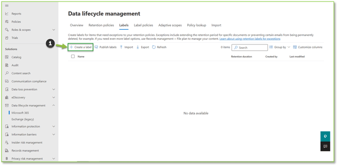 - Navigate to the Retention Labels – Purview portal, select Create a Label.
