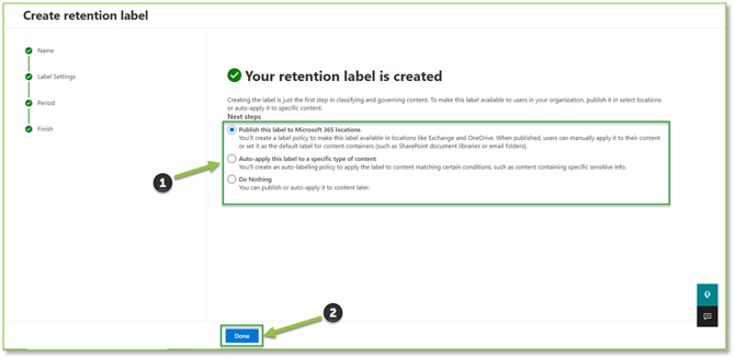 - A final prompt will display that the policy has been created, you will need to specify the next steps for your created policy. Select Done to finalize the creation process.