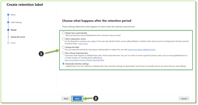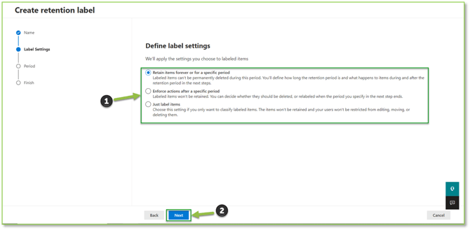 - Next you will be able to configure retention handling; this involves how items will be labeled, how long they will be held for, and how end users can interact with the items after they have been labeled. Select Next to proceed.