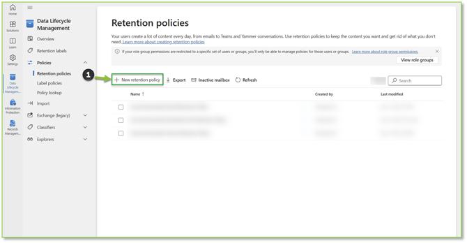 - Navigate to the Retention Policies – Purview portal, locate and select the New Retention Policy action.