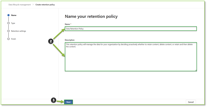 - You will supply basic identification information such as the Name and Description for the policy. Select Next to proceed.