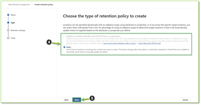 - Next you will define which type of retention policy you want to configure; either adaptive which will identify items off properties (requires E5 licensure) or static which will look at a specific location for analysis. Select Next to proceed.