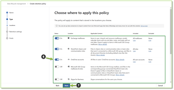 - You will apply the areas to which the policy will scan for items. Select Next to proceed.