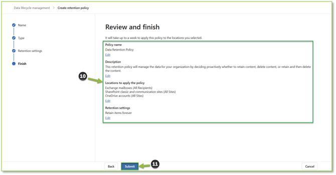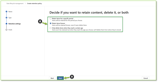 - You will be prompted to define whether the policy will retain the items indefinitely or for a set time frame with the possibility of deleting the items once it reaches the expiration period. Select Next to procced to revisions.