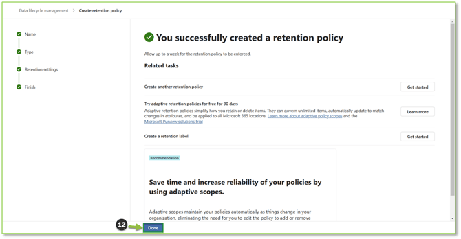 - A final prompt will display that the policy has been created and that it will take some time for the label to generate on the user application side. Select Done to finalize the creation process.