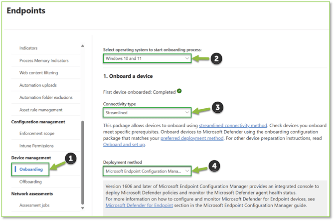 - Navigate to the Endpoint Onboarding – Microsoft Defender portal, from this page specify the Operating System as Windows 10 and 11, Connectivity Type as Streamlined, Deployment Method as Microsoft Endpoint Configuration Manger current branch and later.