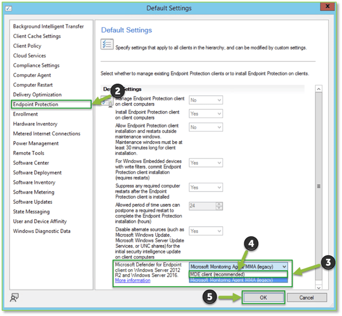 - For Microsoft Defender for Endpoint Client on Windows Server 2012 R2 and Windows Server 2016 settings, the default value is set as Microsoft Monitoring Agent MMA (legacy) which needs to be changed to MDE Client (recommended). Select OK to continue.