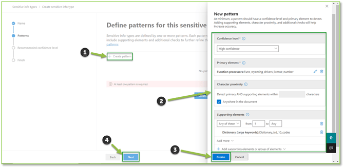 - Next select Create Pattern to define the rule your policy will utilize to detect sensitive information. Provide the pattern with a confidence level, primary element, and any other additional information that will improve accuracy. Select Create to generate the rule, select Next to proceed.