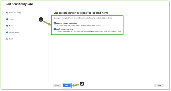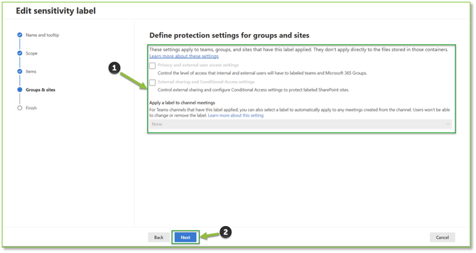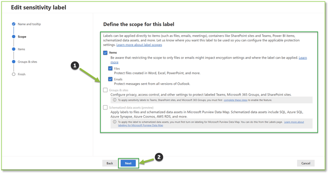 - Groups & Sites: Specifies which SharePoint or Teams sites or groups the label will be enforced on; this requires E3 Licensure.
