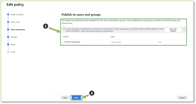 - Users and Groups: Specifies which users or non-security groups will have access to this label or be required to use this label.