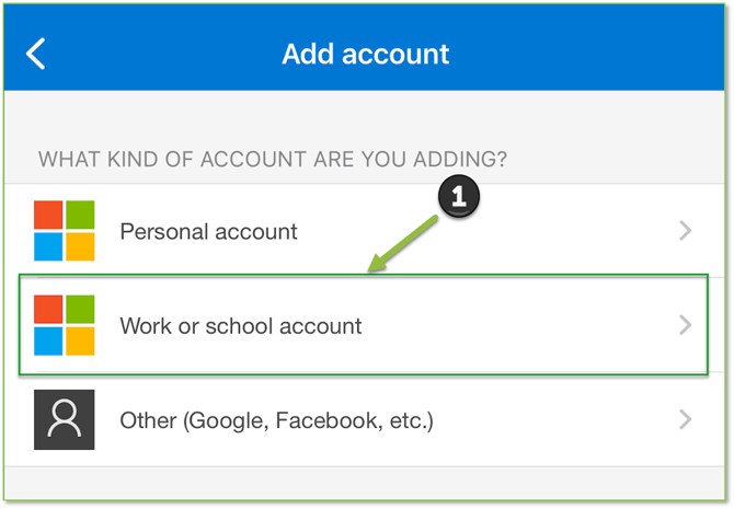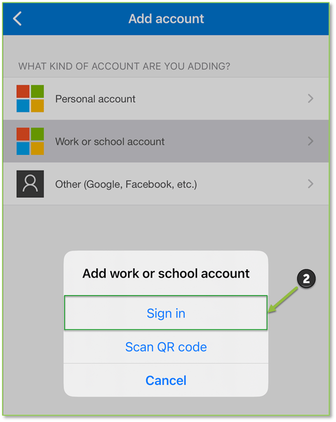 - When you access the Authenticator App you will be prompted to link a Microsoft Account, in our case we will be selecting the Work or School Account option.