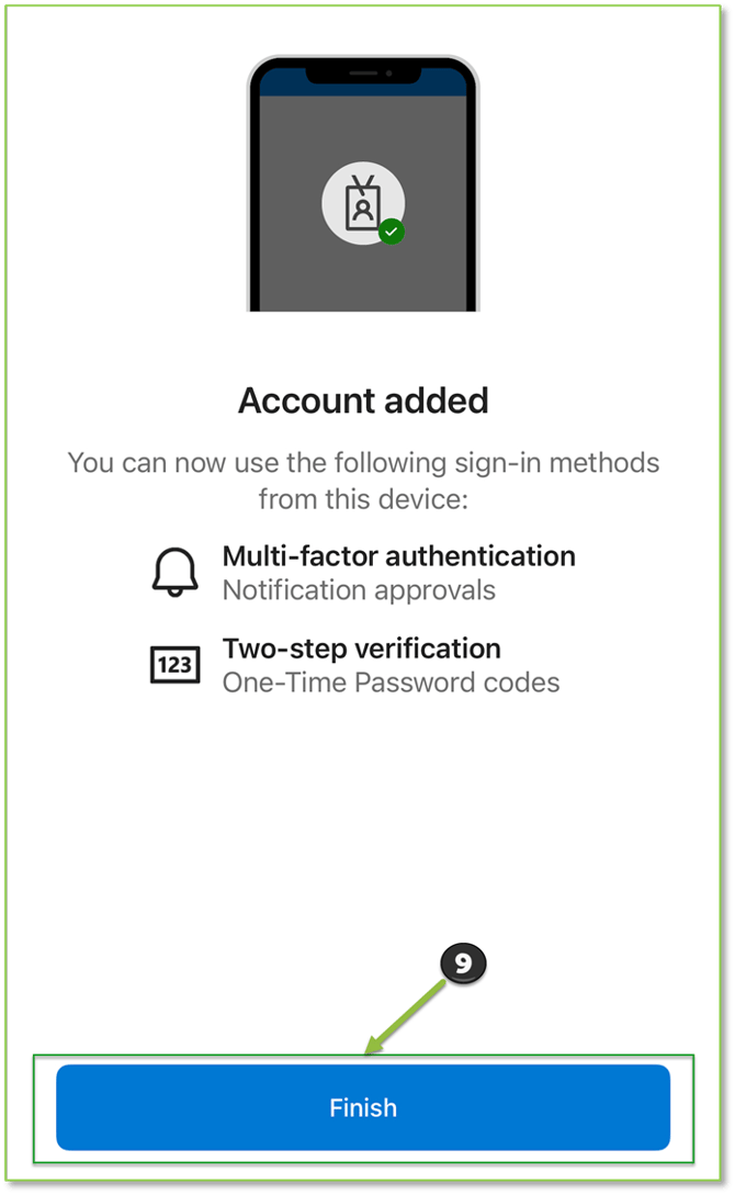 - When successfully completed you will be notified that the account was added, select finish to finalize the Authenticator App establishment phase.