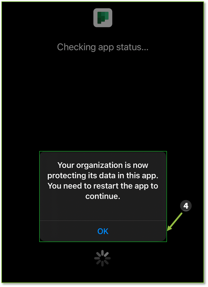 - Once you supply the credentials for the account you will be redirected to the Authenticator App for a verification process, if done successfully you will be redirected back to the original app and receive a notification that Your organization is now protecting its data in this app. Select Okay to initiate the application restart.