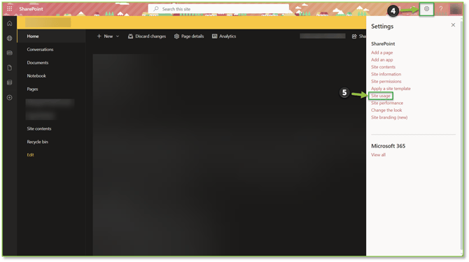- Once the desired site is opened, we will want to locate and select the gear icon at the top right of the page. From the generated dropdown, we will want to locate and select the Site usage option.
