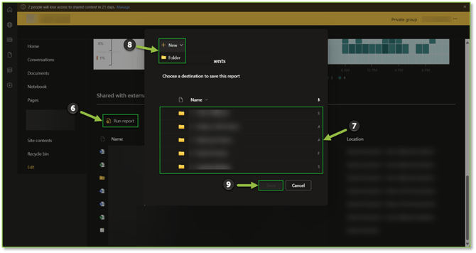- From the Site usage page, we will want to scroll down to the Shared with external users section. Once there we will want to locate and select the Run report action, a popup will be displayed where you will be able to designate a storage location for the report, this can either be an existing folder or select + New to create a new folder to store the report. Select Save once a desired report storage location has been specified.