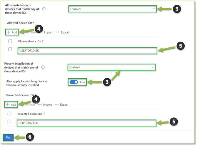 - The default rules will be displayed. Begin by selecting the dropdown beside the Device Installation Restrictions blade. Locate the Allow device IDs or Prevent device IDs option depending on the desired outcome for USB handling, select the Add button below the desired previously listed header. A text box will be generated where you can specify the necessary device identifier. The allow or block list is only available if the Allow or Prevent installation of devices that match any of these device IDs security settings is set to Enabled, the prevent setting also has an additional unique setting Also apply to matching devices that are already installed that will remove already installed USB devices if they do not match the newly enforced criteria. Select Next to continue.